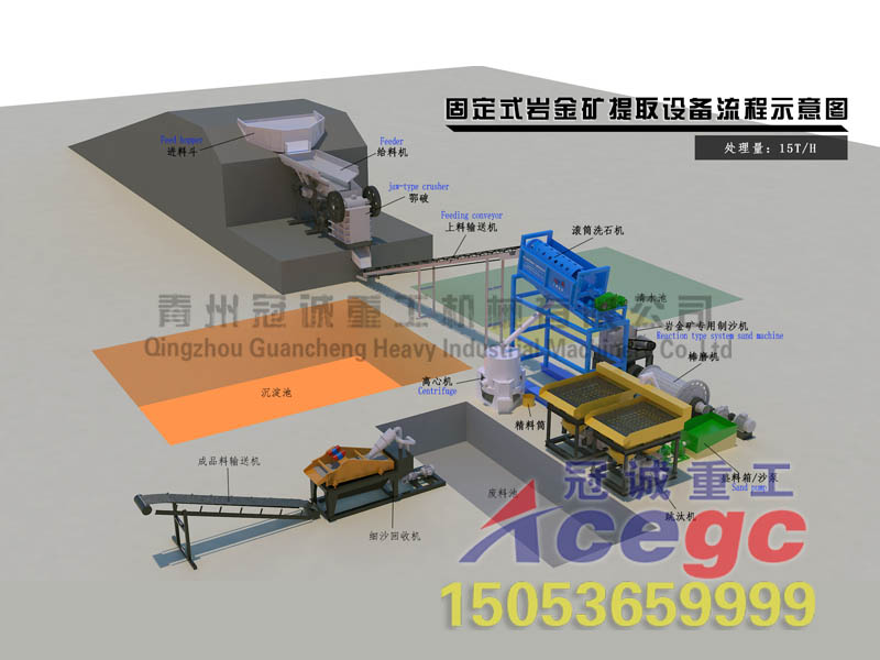 6mm以下細(xì)料進(jìn)入一臺(tái)80#選金離心機(jī)進(jìn)行精選,廢料排入廢料池中;6mm以上粗料進(jìn)入一臺(tái)制沙機(jī)內(nèi)進(jìn)行破碎制沙,然后進(jìn)入一臺(tái)棒磨機(jī)進(jìn)行棒磨,棒磨后的細(xì)料排入盛料箱內(nèi)通過(guò)沙泵打入一臺(tái)80#離心機(jī)進(jìn)行精選,廢料排入廢料池中。